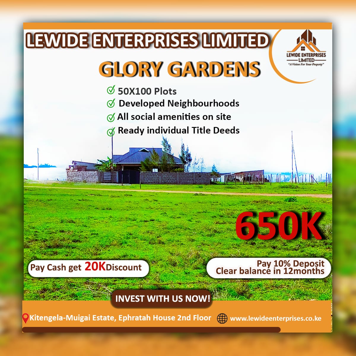 Lewide Enterprises Limited stands out as one of Kenya's leading real estate companies, committed to delivering genuine and affordable property solutions to all aspiring landowners. With a proven track record of excellence and professionalism, we have made it our mission to ensure customer satisfaction in every transaction. Our dedicated team of certified land surveyors, real estate agents, and customer service representatives work collaboratively to guide you through your investment journey. When you choose Lewide, you choose a trusted partner who guarantees transparency, integrity, and value for your money.